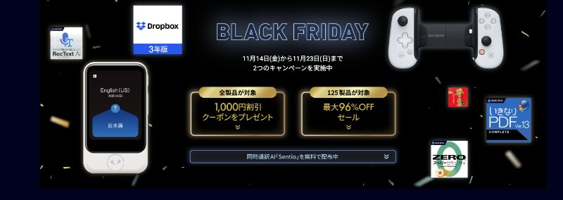 「宛名職人」の販売元であるソースネクストでは11/23までブラックフライデーセールを開催中
