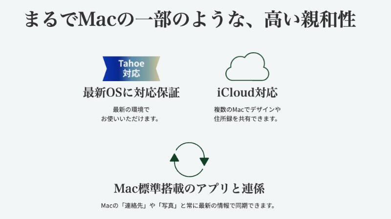 | 対応 | macOS Tahoe(v26.0)、macOS Sequoia(v15.0),macOS Sonoma (v14.0),macOS Ventura (v13.0),macOS Monterey (v12.0) |