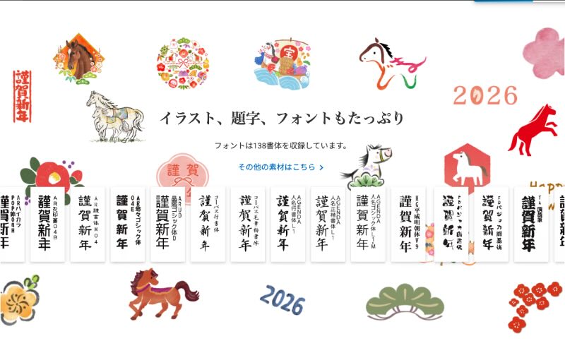 | 素材数 | 書体:138書体 デザイン:1,000 素材:15万 |