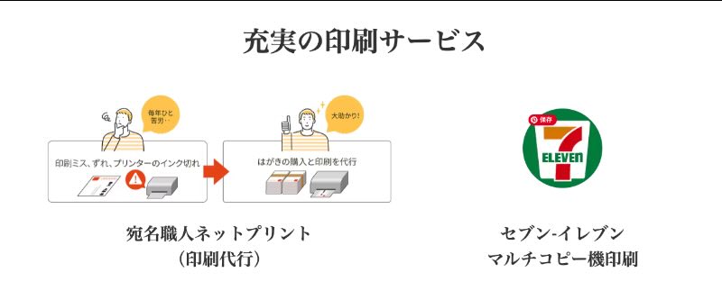 | 印刷方法 | 自分のプリンター、宛名職人プリントサービス、セブンイレブンマルチコピー機 |