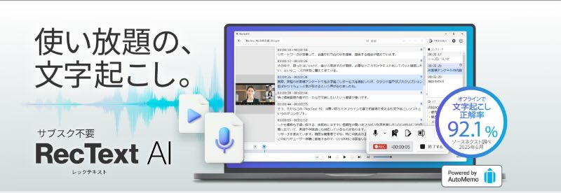 RecText AIは、買い切り・高精度・軽量・オフラインという強いメリットを持つ文字起こしソフトです。