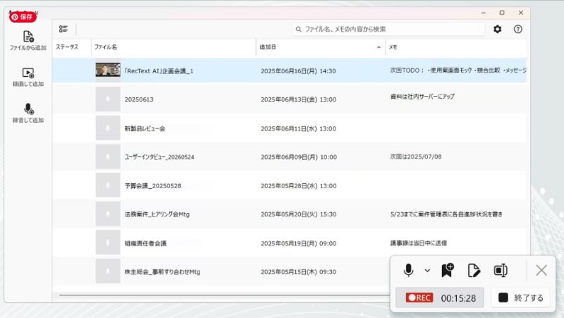 別ソフトで録音しなくても、RecText AIだけで録画・録音から文字起こしまで完結。