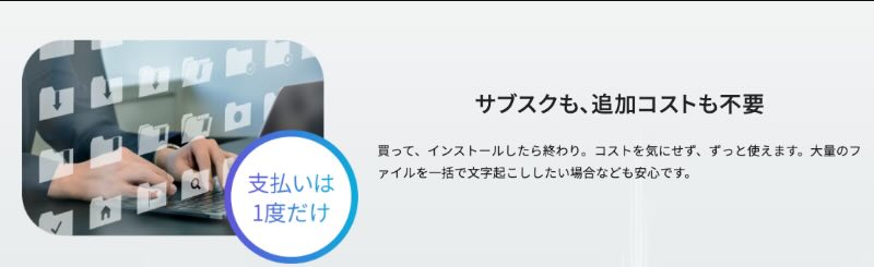 ネット接続不要・サブスク不要・買い切りで使えるのが最大の特徴で、近年増えているクラウド型文字起こしサービスとは一線を画します。