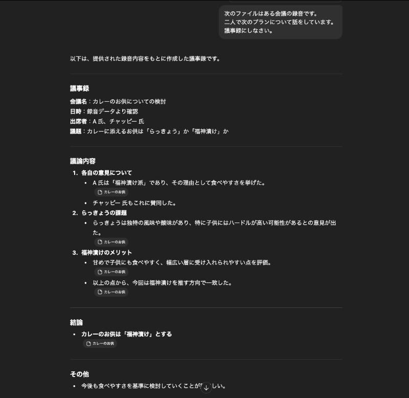 議事録などもしっかり作ってはくれますが、そこはあくまでChatGPTを利用しないといけません。