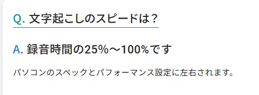 | 文字起こし | 所要時間 | – | – | データの時間の半分から同じくらいの時間がかかる。 |